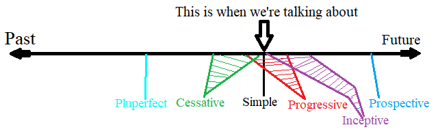 One important thing to keep in mind: terminology varies across languages. The same name in Spanish and Ebören don't necessarily mean the same thing. The names are consistent within a language, but if you learn the Ebören aspects, don't be confused if you try to learn aspect in a different language and it makes no sense. For example, in Spanish perfect and cessative are not distinguished, perfect is split into multiple aspects, and there's no equivalent of the inceptive or prospective at all. (For what the heck all those words really mean see list below.) This isn't just Ebören being weird; English versus Spanish commonly use different terminology as well.