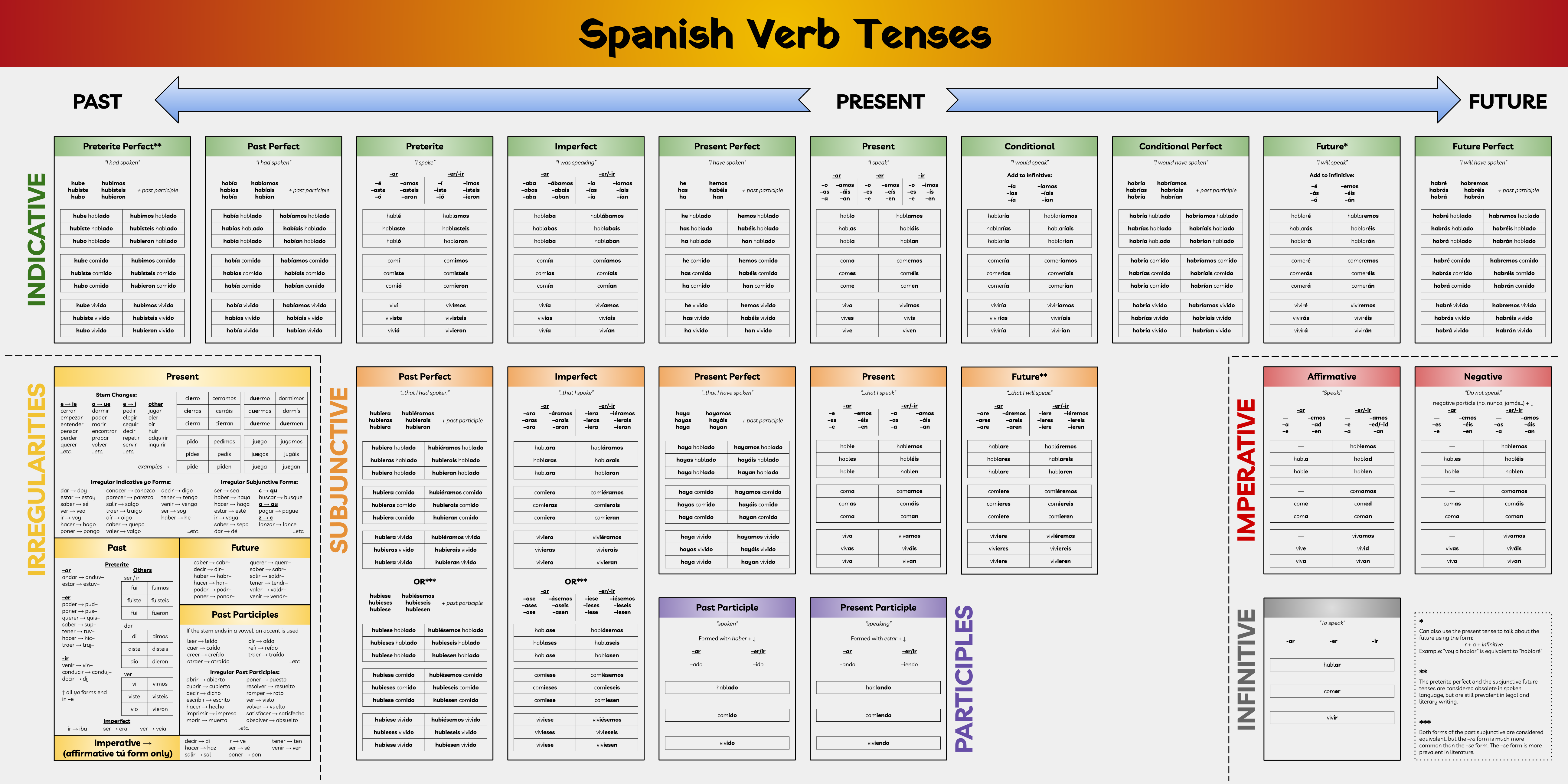 Have you ever tried to learn Spanish and gotten stuck with "hablo" versus "hablamos"? What about "olvides" versus "olvidó"? For reference here's a chart to convey some of the scale of Spanish verb inflection.